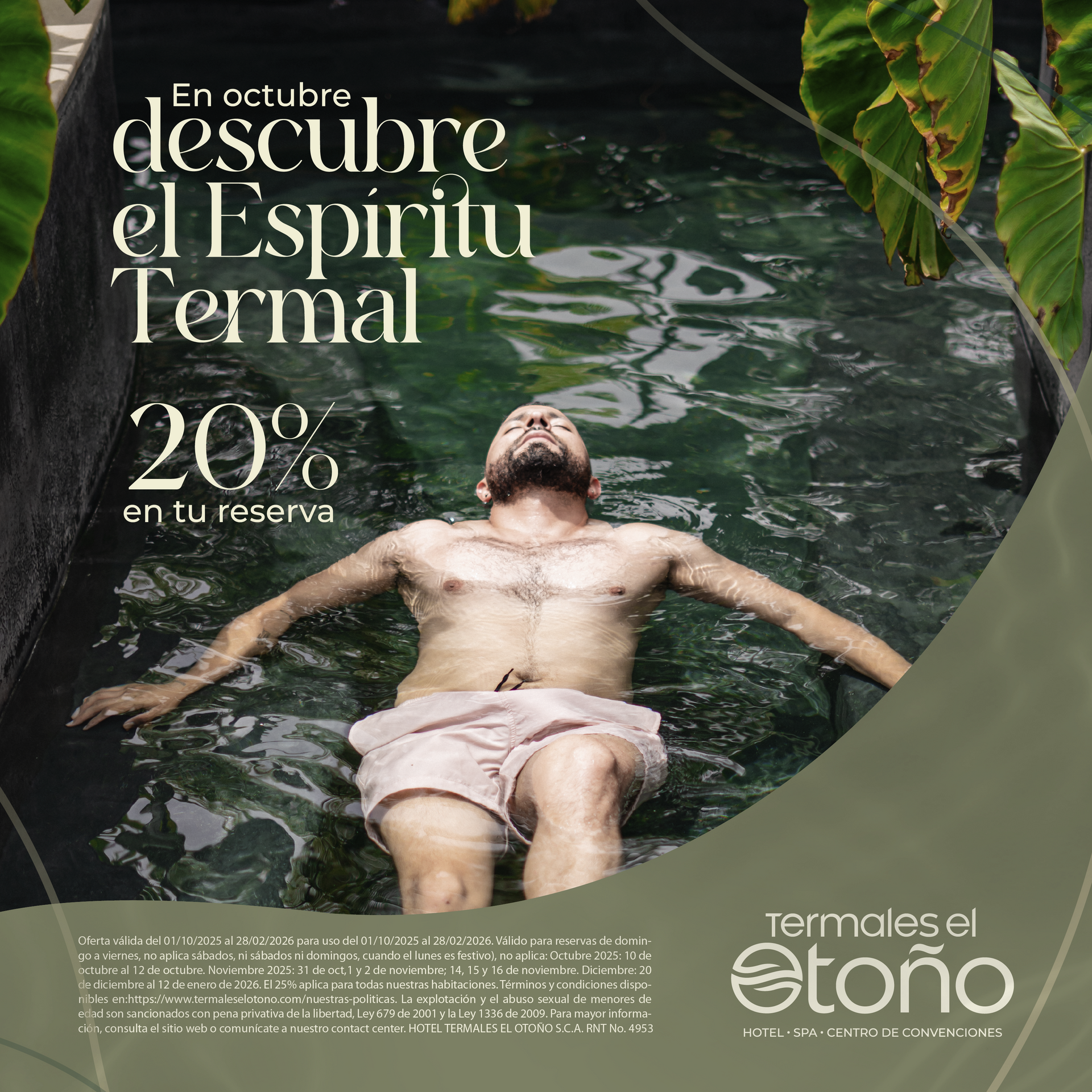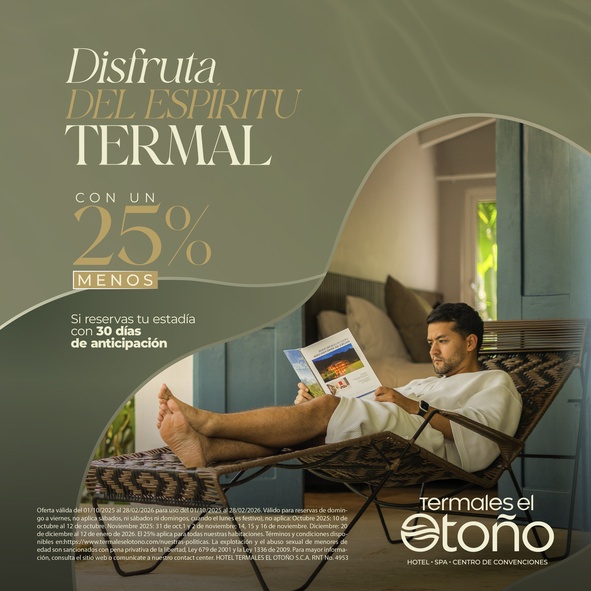 Anticipa tu relax y ahorra 25% En Termales El Otoño sabemos que la mejor manera de asegurarte un momento de bienestar es planearlo con tiempo. Por eso, si reservas tu estadía con 30 días de anticipación, recibirás un 25% de descuento y podrás disfrutar de nuestras aguas termales, espacios de relajación y conexión con la naturaleza sin preocupaciones.
